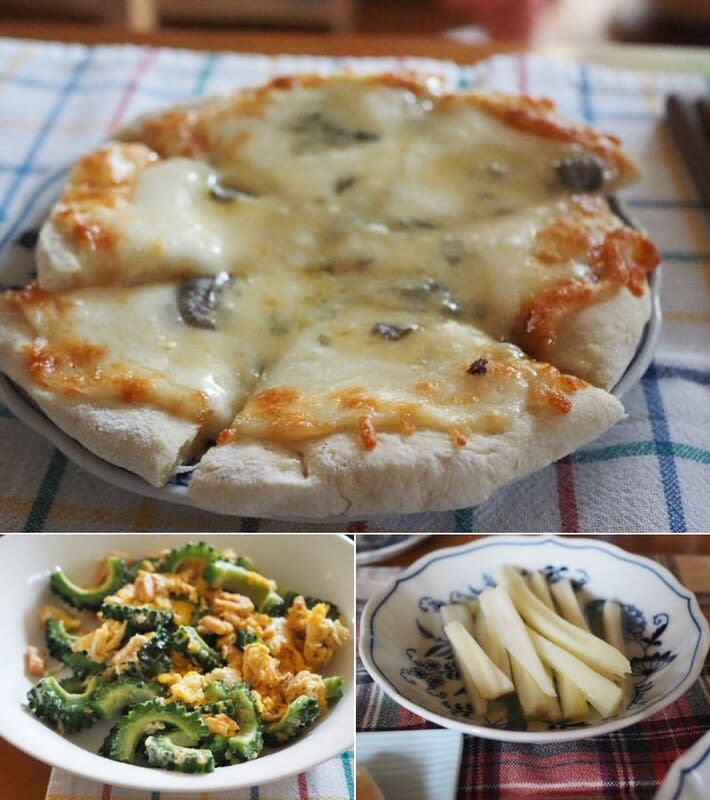 ピザ(皮も作ったの)とゴーヤチャンプルとセロリのサラダ